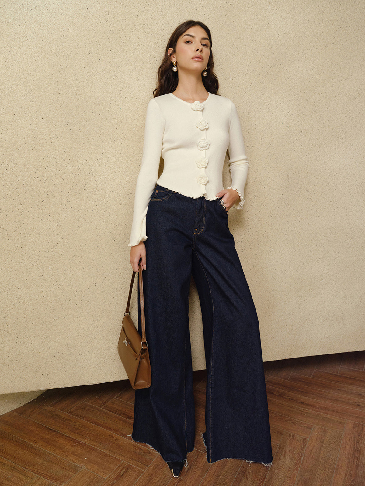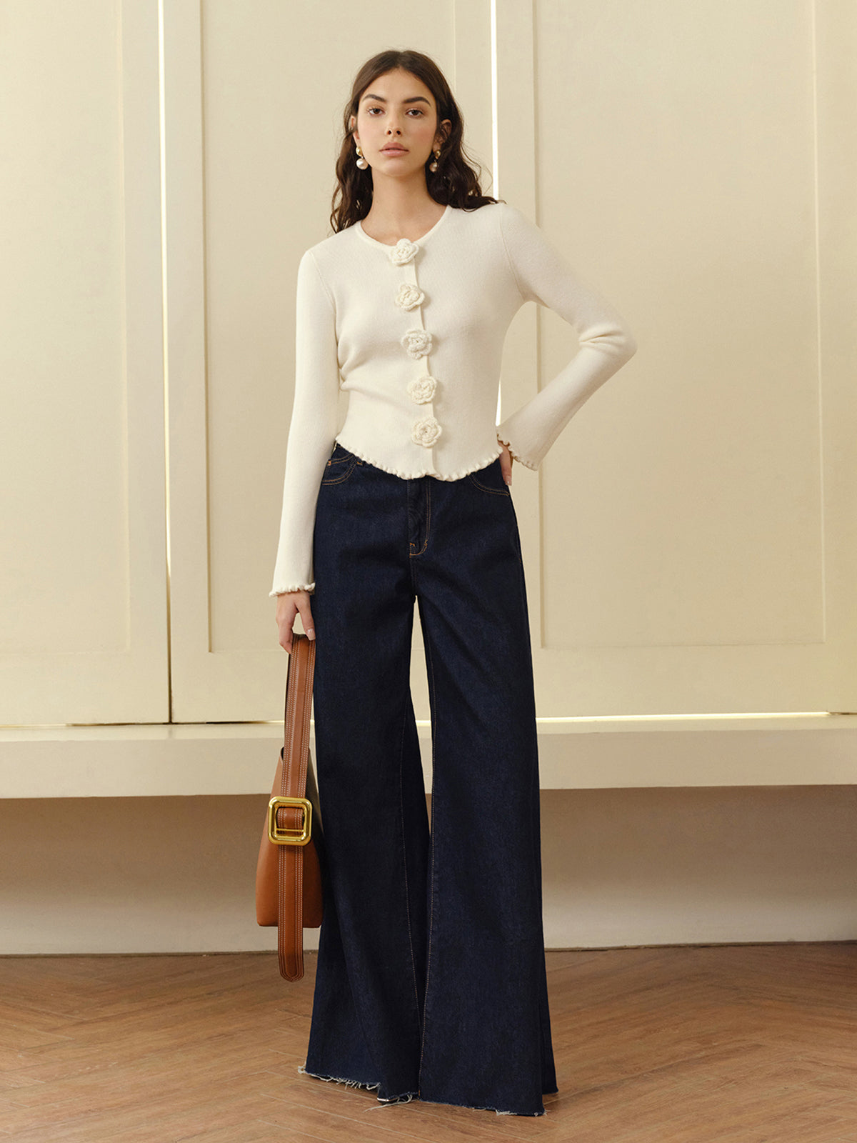 Ce cardigan crème orné de boutons fleurs en relief apporte une touche poétique à une silhouette féminine et élégante.
