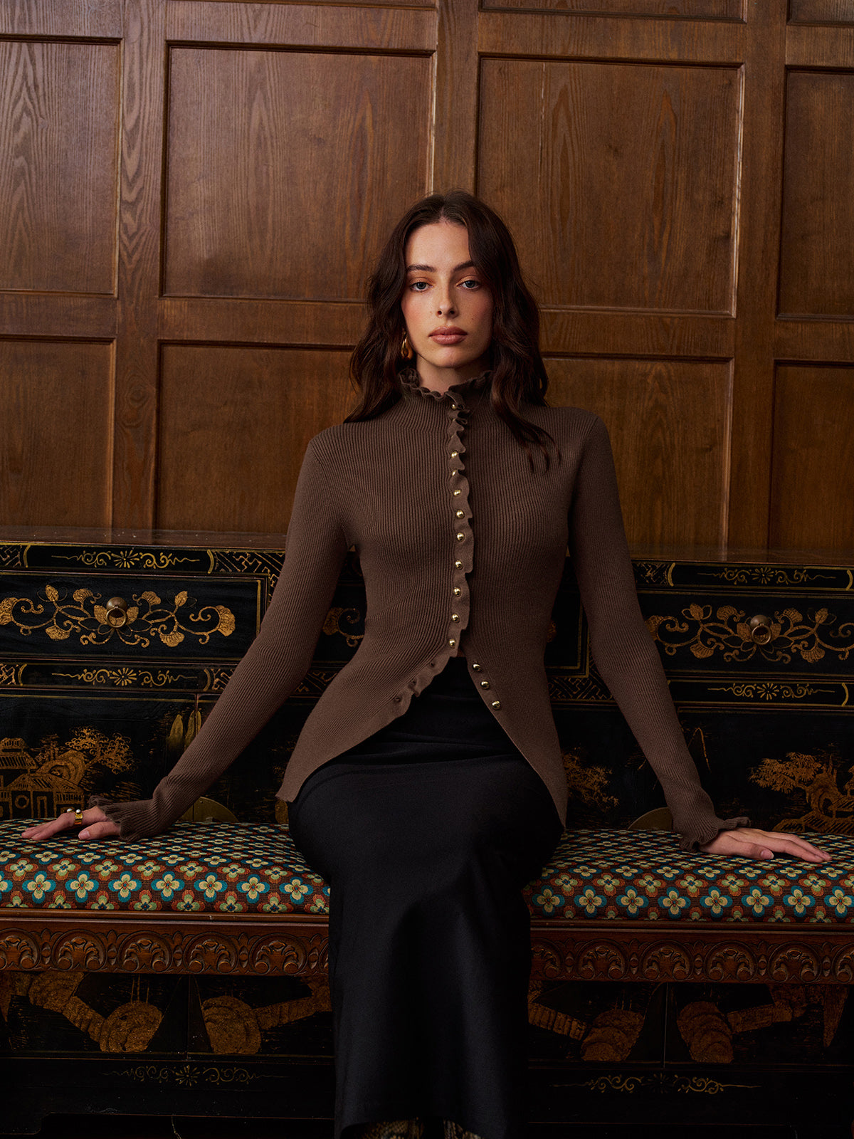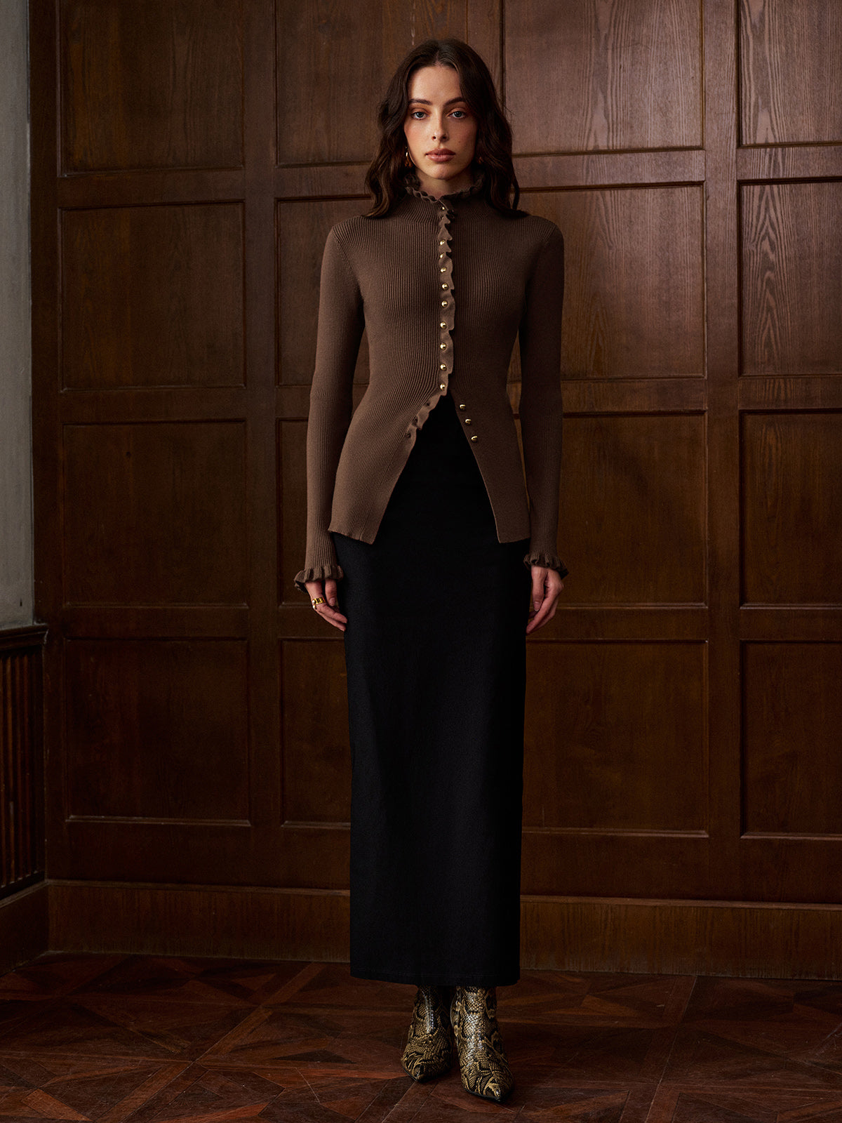 Cardigan Perlé | Marron Élégant | Finitions Volantées et Silhouette Cintrée