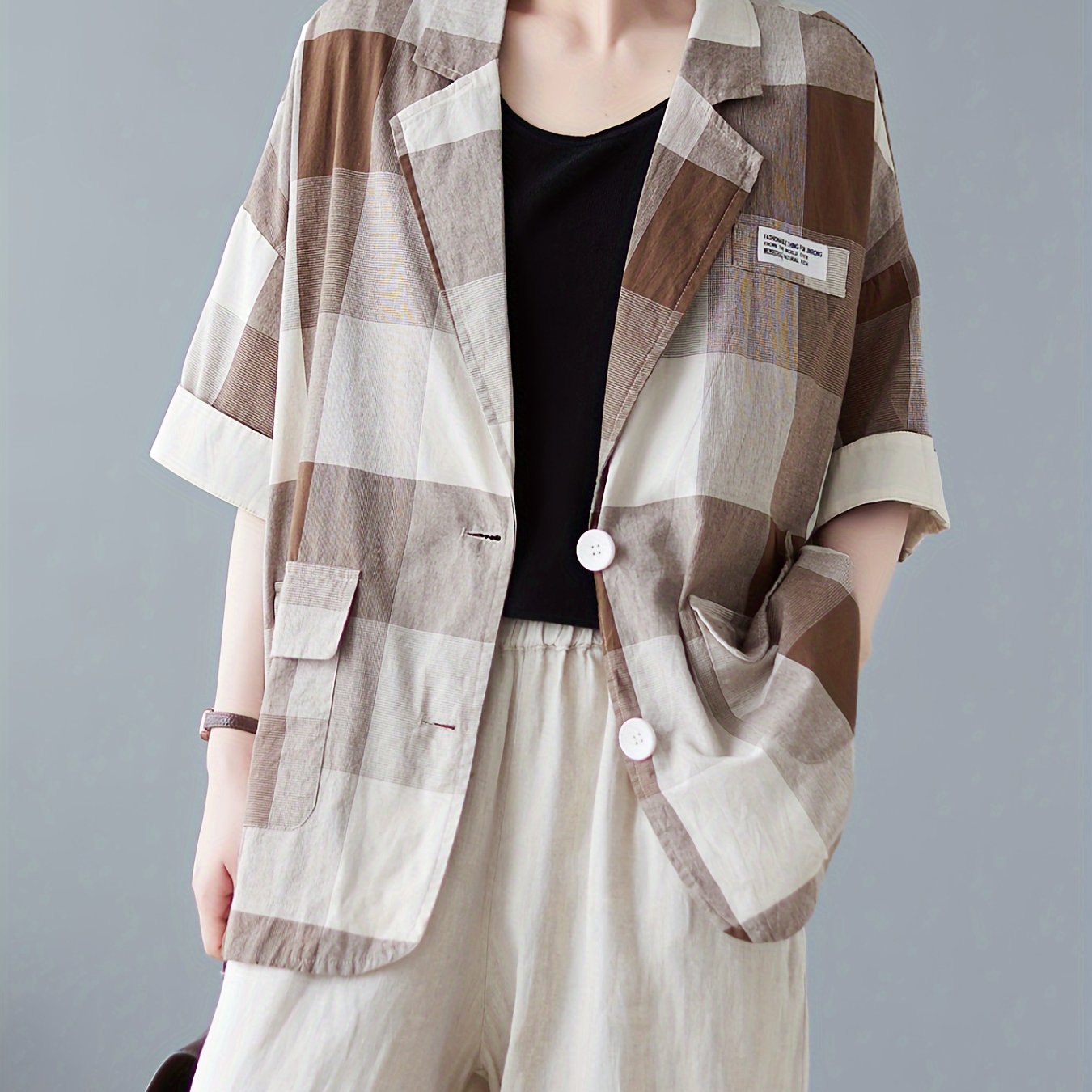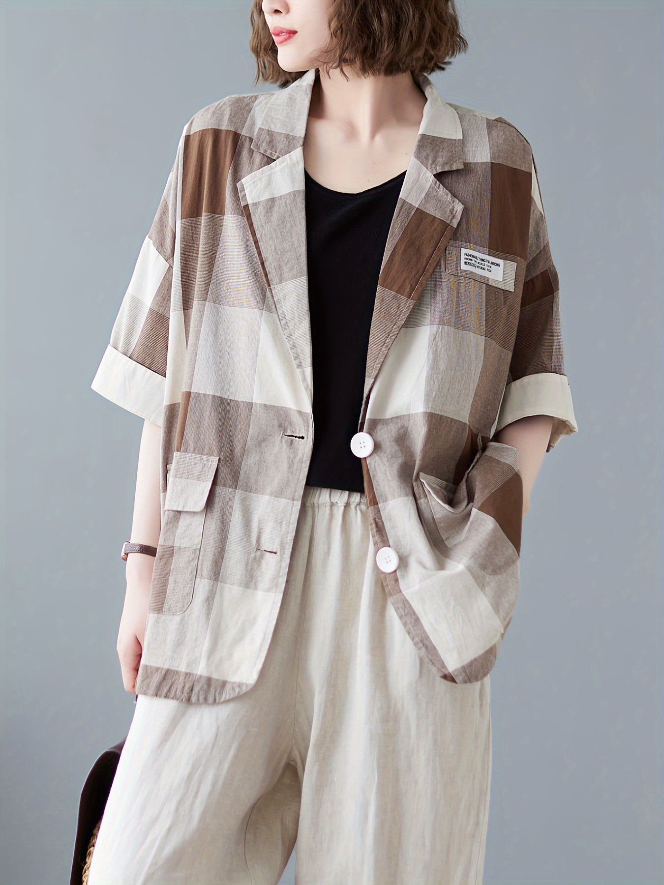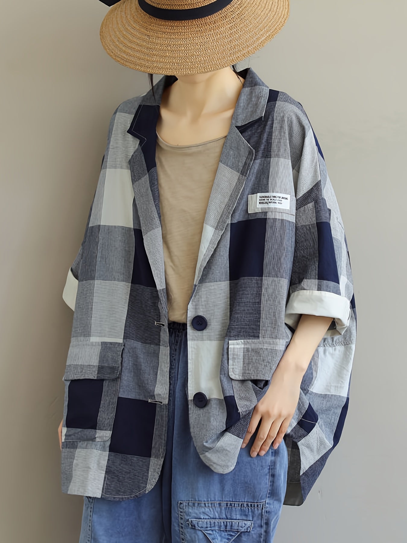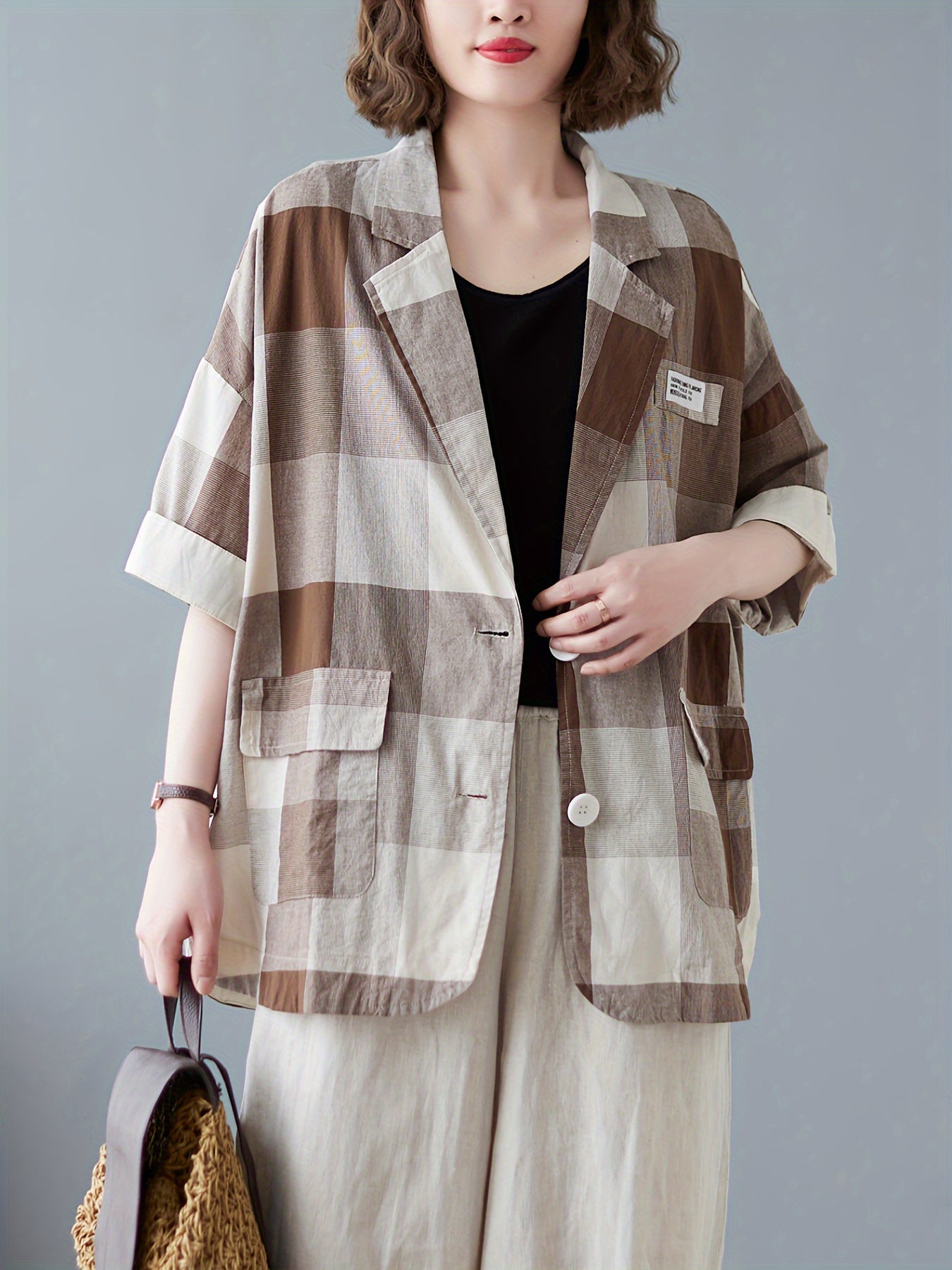 Son motif patchwork à grands carreaux joue sur les contrastes, tandis que sa coupe fluide et ample apporte un confort décontracté.