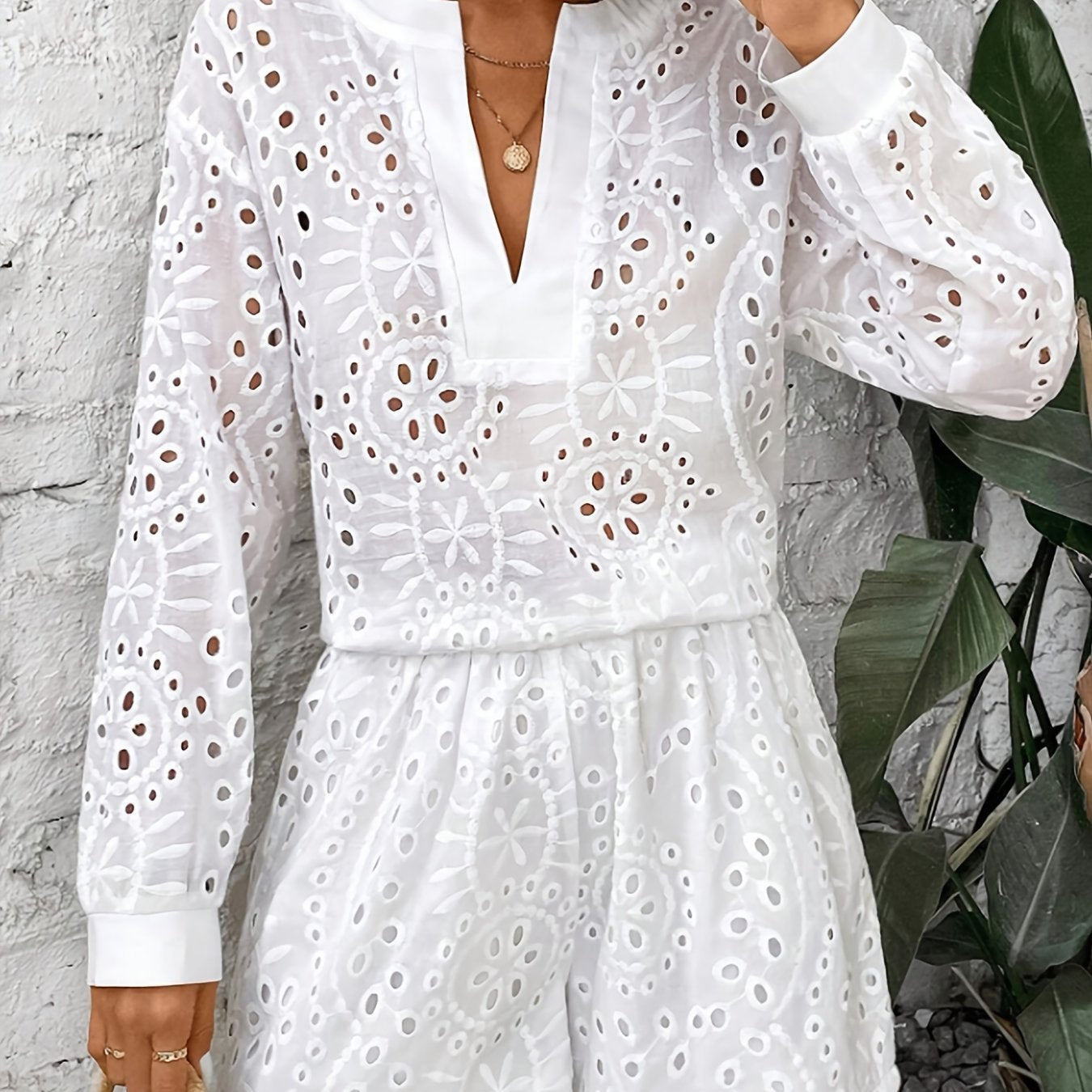 Conçue avec une coupe légèrement ample et des manches longues, elle séduit par ses motifs brodés ajourés qui laissent subtilement entrevoir la peau.