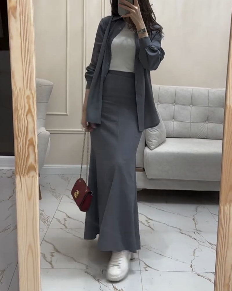• Design : Chemise boutonnée, débardeur ajusté et jupe longue à taille haute