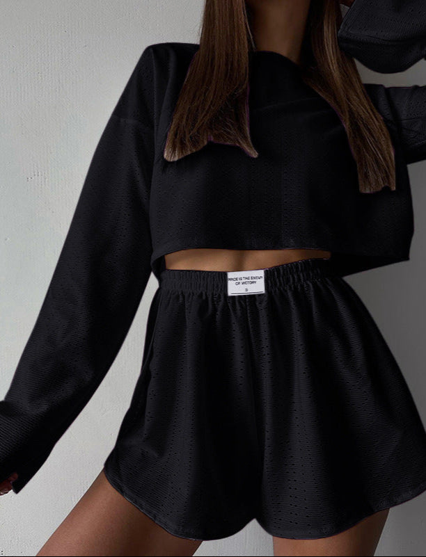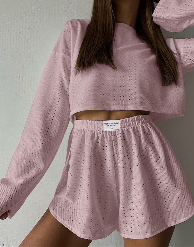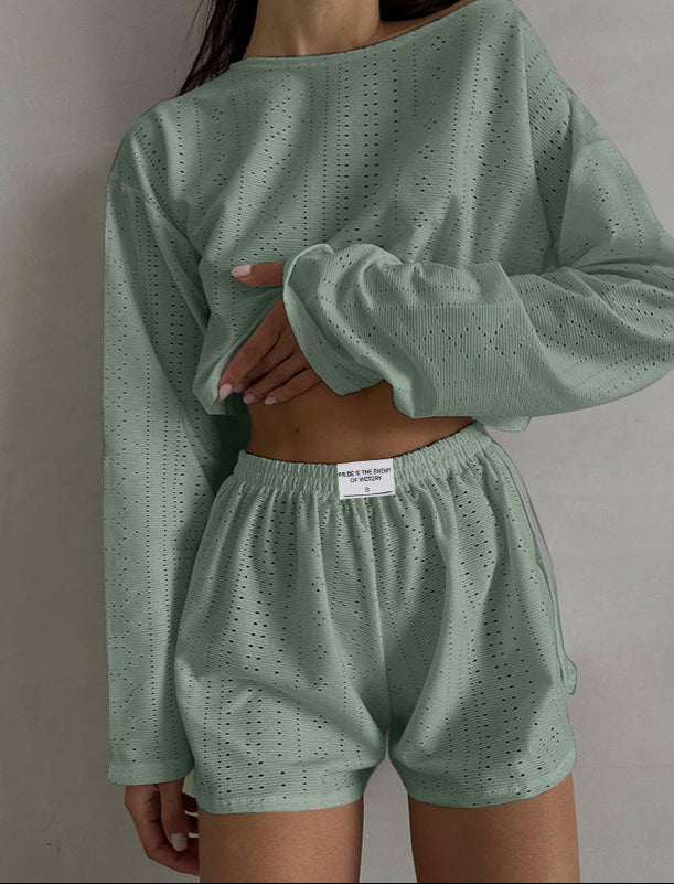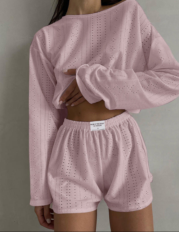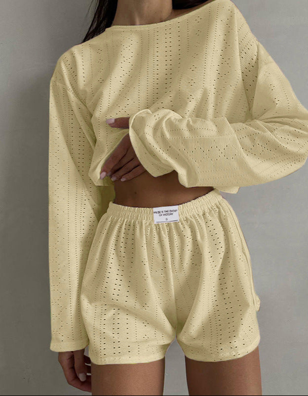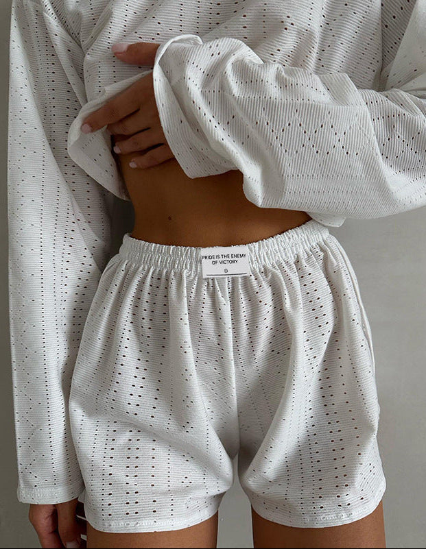 Ce set ajouré blanc, composé d’un top à manches longues et d’un short taille élastique, combine confort, douceur et style minimaliste.