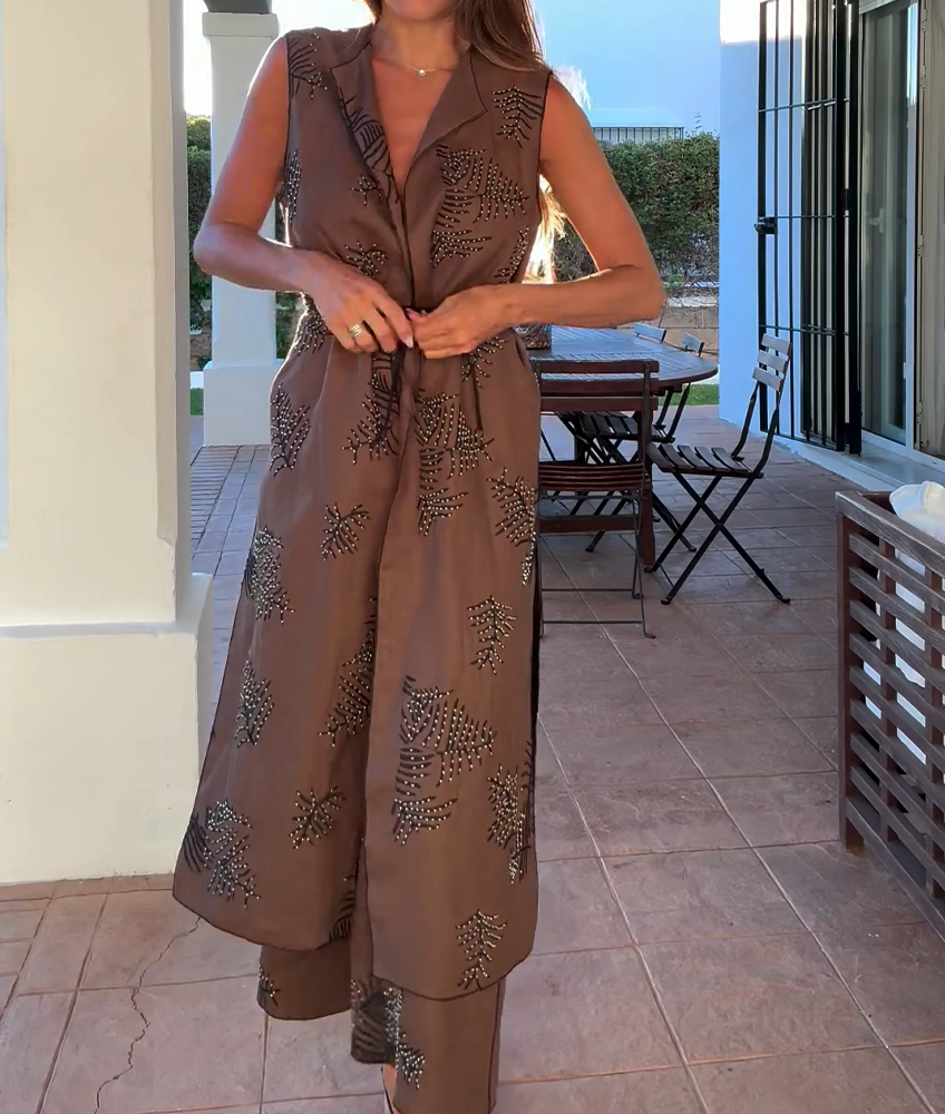 Cet ensemble coordonné brun avec gilet long sans manches et pantalon orné de broderies offre un look raffiné et contemporain.