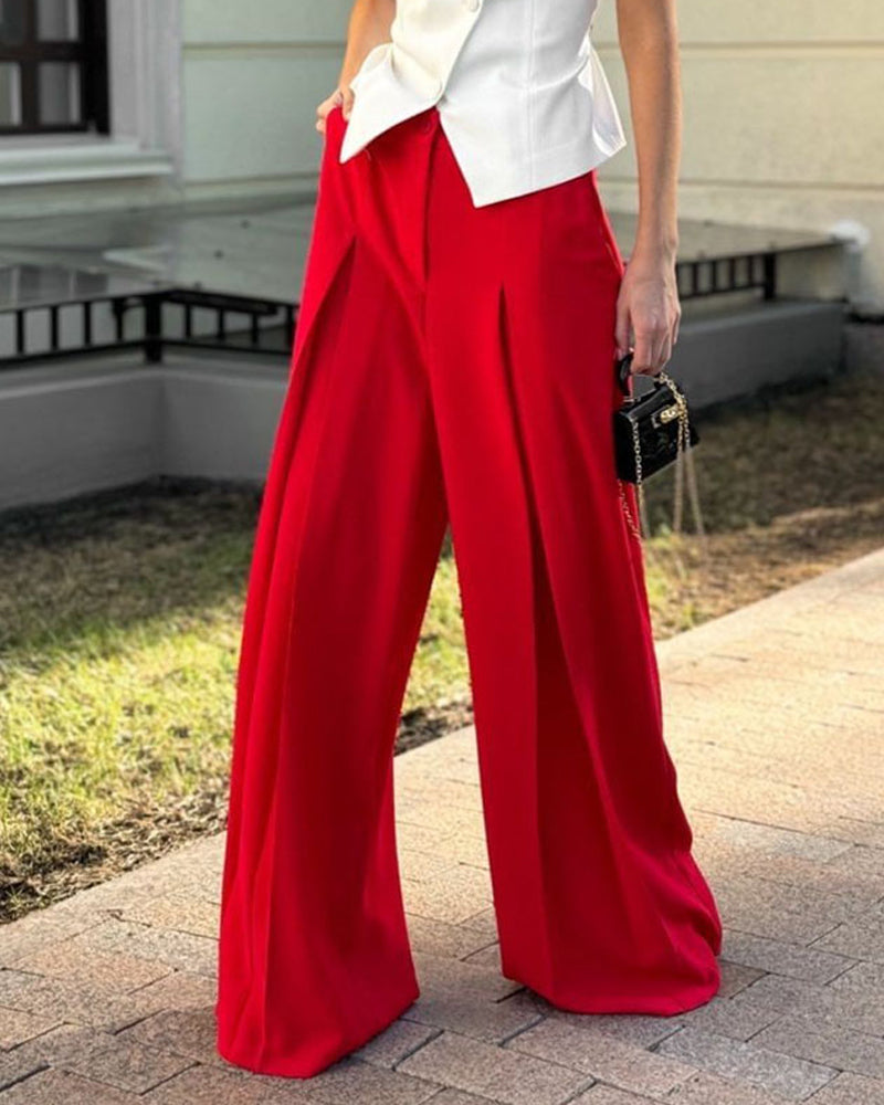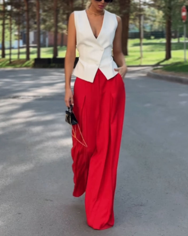 Cet ensemble sophistiqué marie un gilet sans manches blanc à un pantalon large rouge vif pour un contraste puissant et raffiné.