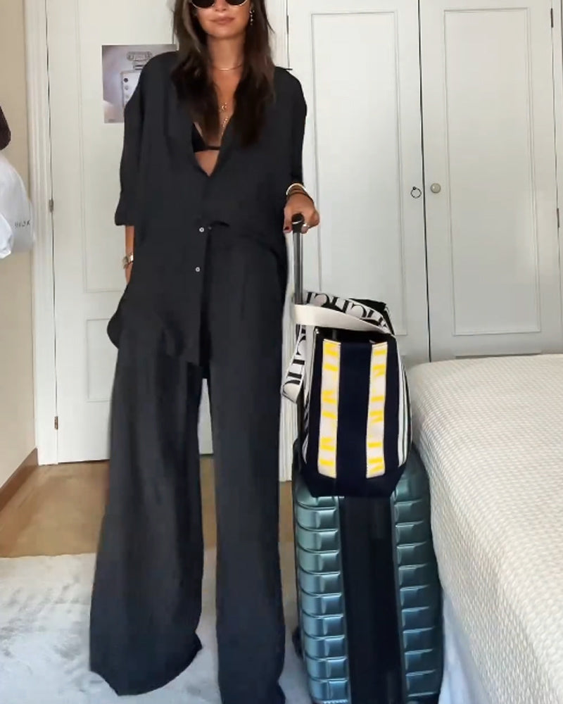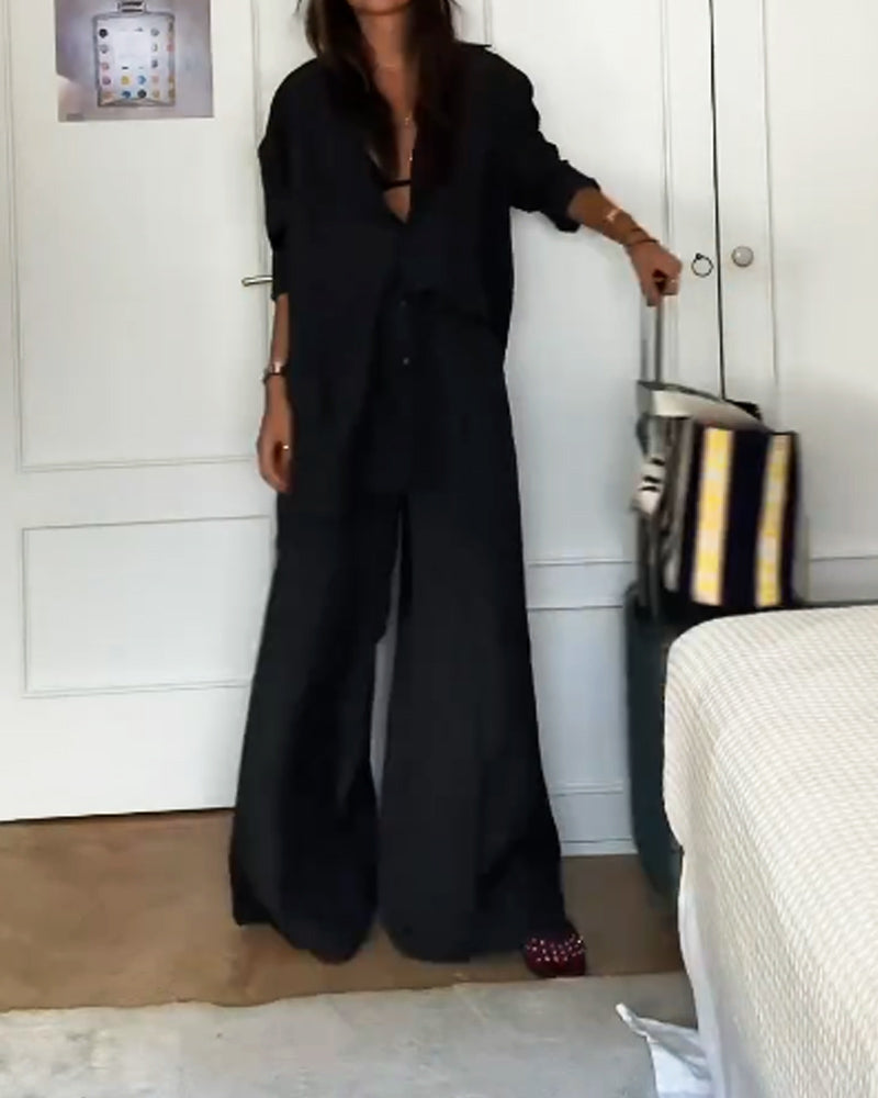 Ce set deux pièces associe une chemise ample à manches courtes et un pantalon palazzo pour une silhouette moderne et confortable.