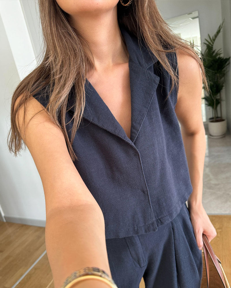 Cet ensemble sans manches en lin apporte une touche de fraîcheur avec son tissu naturel, sa coupe fluide et sa couleur tendance.