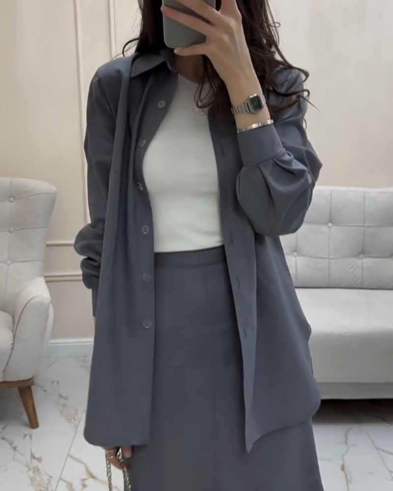 Ensemble Coordonné : Jupe longue taille haute et surchemise à manches longues assorties.