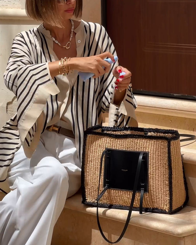 Ce set rayé beige et bleu marine incarne le chic méditerranéen : une chemise ample à rayures verticales combinée à un pantalon blanc fluide à taille haute.
