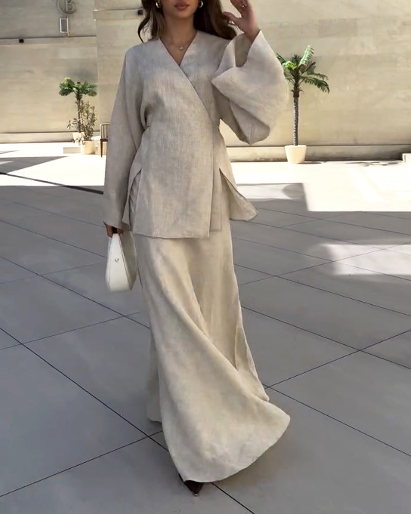 • Design : Ensemble deux pièces avec veste portefeuille à manches larges et jupe longue fluide