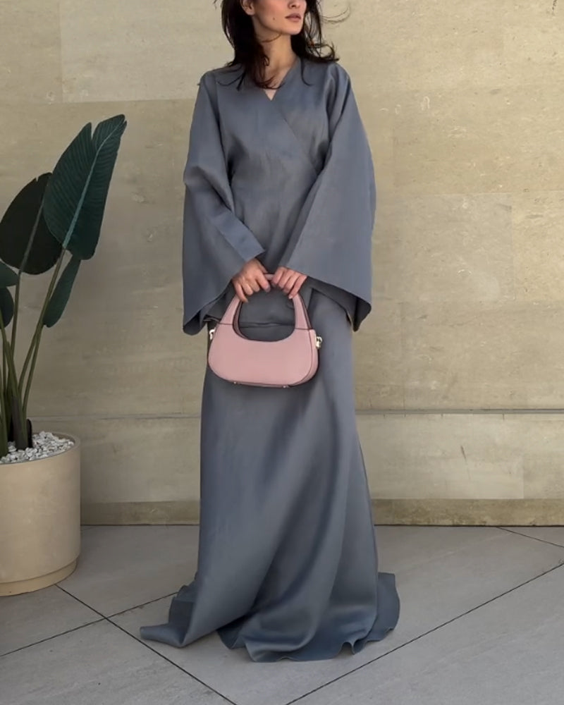 Cet ensemble pur associe une tunique croisée façon kimono et une jupe longue droite pour une silhouette épurée et sophistiquée.