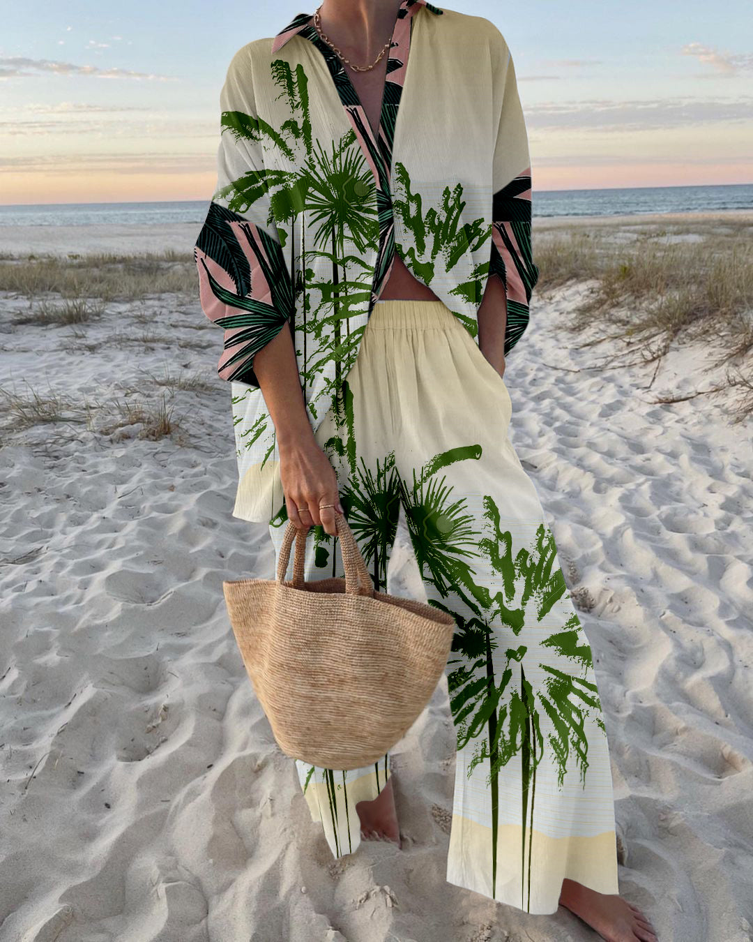 Avec sa chemise ample et son pantalon fluide taille haute, il allie confort, fraîcheur et style tropical chic.