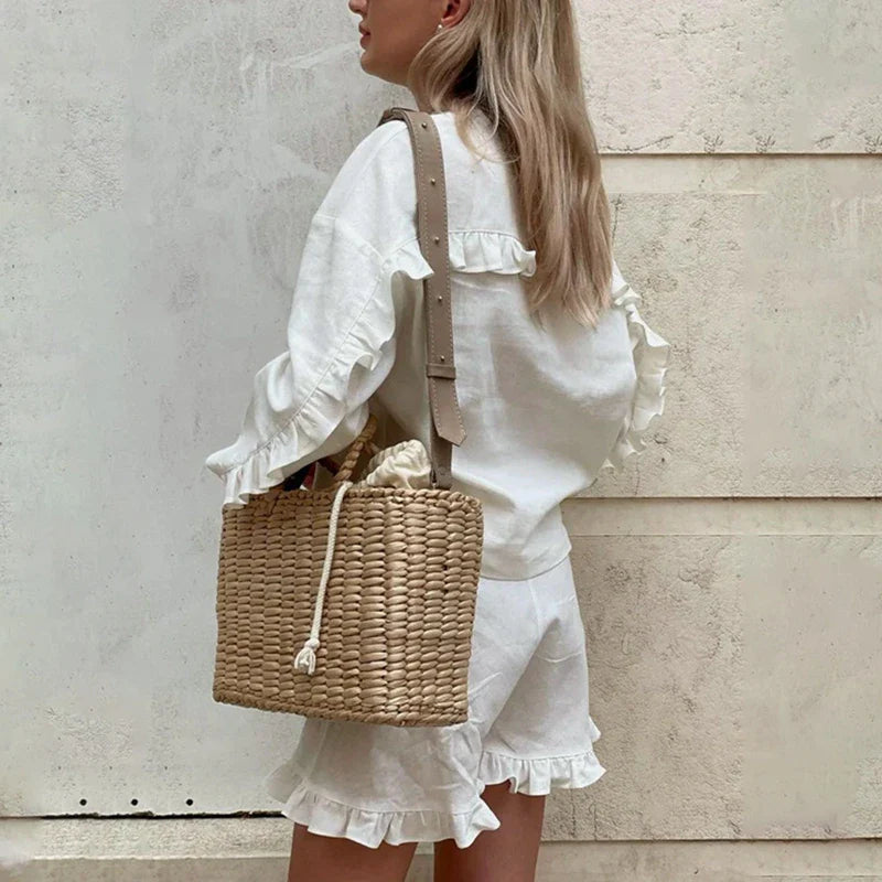 Complétez le look avec un sac en osier et des sandales pour un style estival minimaliste et raffiné.