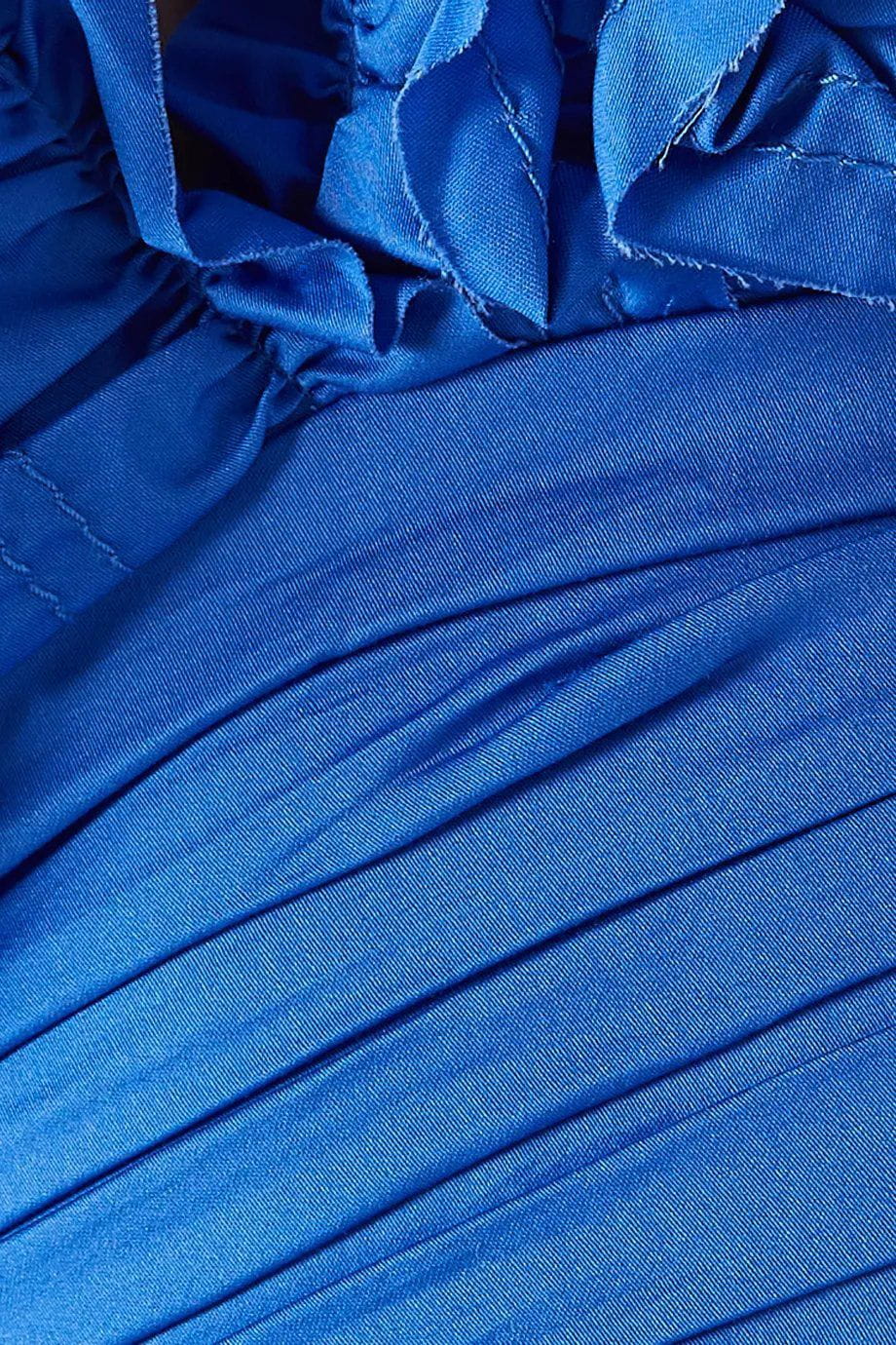 Faites une entrée remarquée avec cet ensemble bleu cobalt composé d’un top à volants structuré et d’une jupe longue à étages.