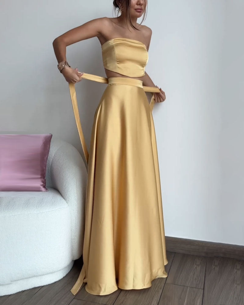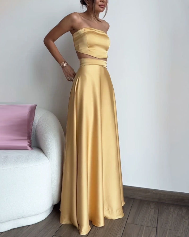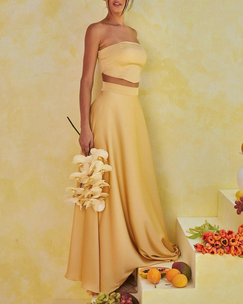Ce set deux pièces jaune satiné, composé d’un top bustier et d’une jupe longue fluide, incarne l’élégance moderne avec une touche de glamour.