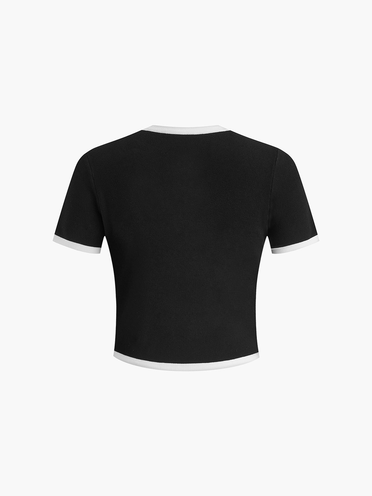 Ce top court blanc à manches courtes avec finitions noires contrastées incarne le raffinement minimaliste avec une touche rétro.