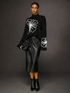 Le Amaya est un pull noir en maille douce, sublimé par un motif floral blanc graphique pour un effet artistique et moderne. Sa coupe ample et son col montant ajoutent une touche sophistiquée, tandis que ses manches évasées apportent une allure chic et fluide. Idéal pour un look raffiné et audacieux.