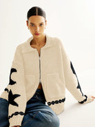 Ce cardigan zippé en maille anthracite, orné de motifs lune et étoile contrastés, est parfait pour affirmer votre style tout en restant cosy.