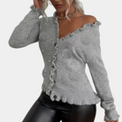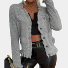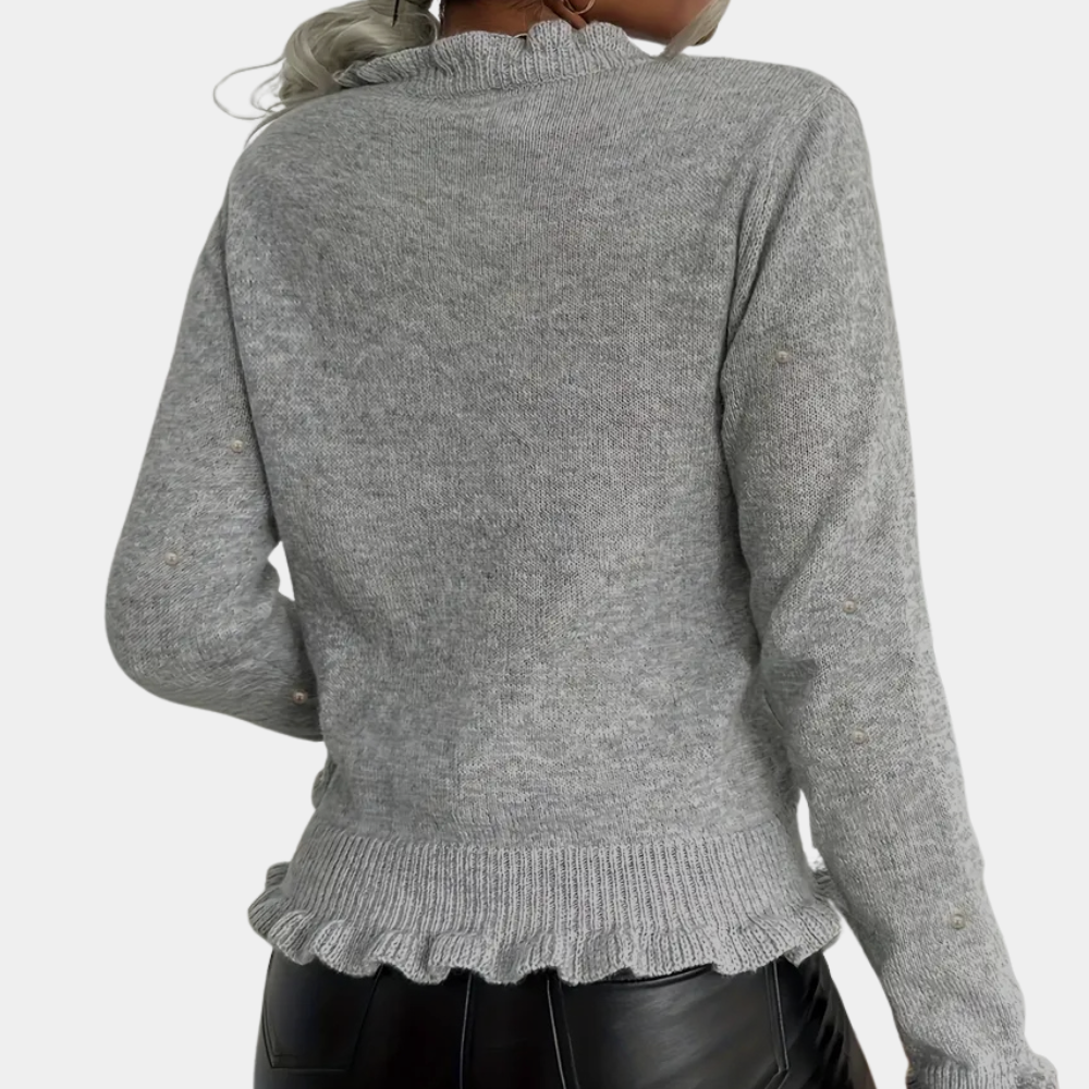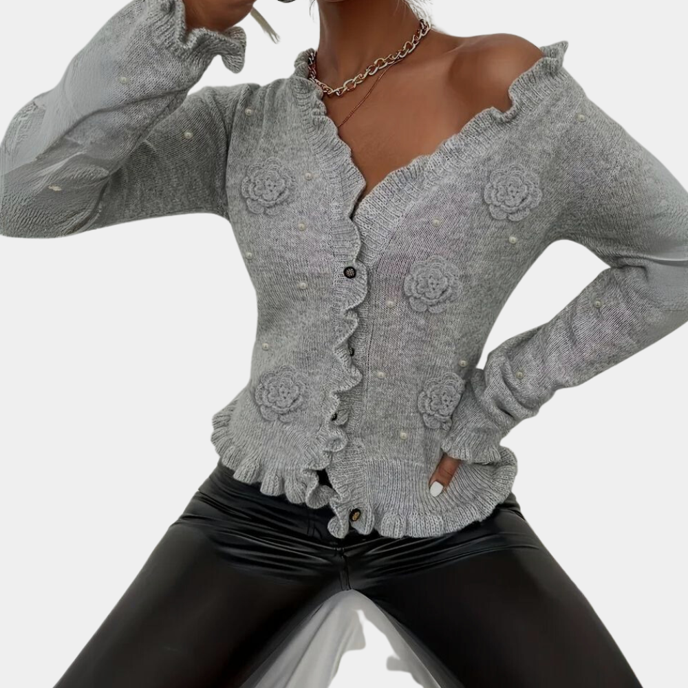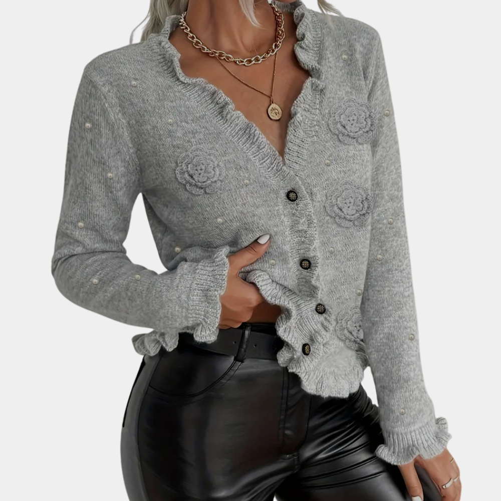 Ce cardigan gris perle en maille ornée de fleurs en relief et de perles délicates apporte une touche douce et élégante à votre style.