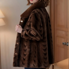 Ce manteau brun effet fourrure se distingue par sa texture luxueuse et sa coupe droite intemporelle.