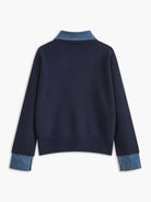 Le Mila est un pull bleu marine au style unique, rehaussé par un col et des poignets en denim contrastant. Sa coupe classique et son tissu doux en maille en font une pièce confortable et polyvalente, parfaite pour un look chic et tendance. Idéal pour le bureau comme pour une sortie décontractée.