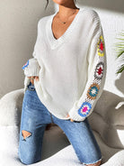 Ce pull en maille épaisse combine douceur et style avec son col en V flatteur et ses manches ornées de détails crochet colorés. Son design unique allie confort et tendance, parfait pour un look décontracté et bohème.