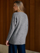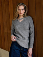 Ce pull gris chiné allie douceur et modernité avec son encolure en V agrémentée d’un détail croisé tendance.