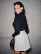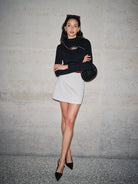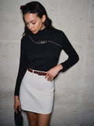 Ce pull noir à col montant se distingue par son empiècement en strass incurvé et sa petite découpe qui dévoile subtilement le haut du buste.