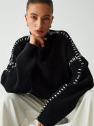 Ce pull noir oversize en maille côtelée est rehaussé de surpiqûres contrastées blanches qui lui donnent une touche graphique contemporaine.