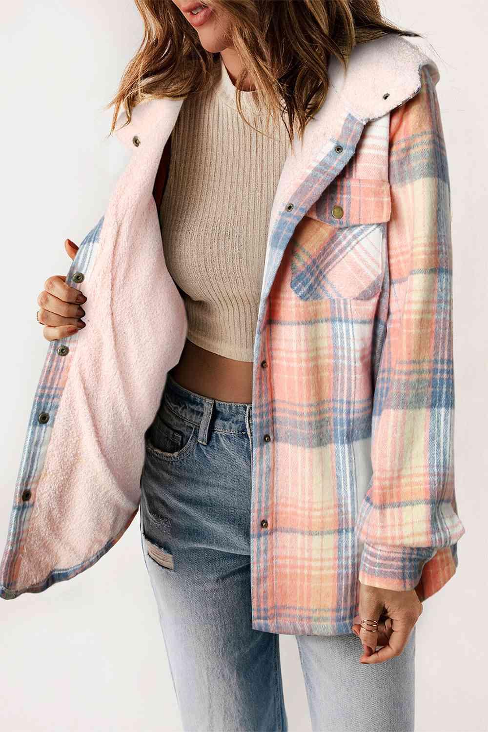 Cette surchemise à carreaux pastel avec doublure sherpa est parfaite pour un style cosy et tendance en automne ou hiver doux.