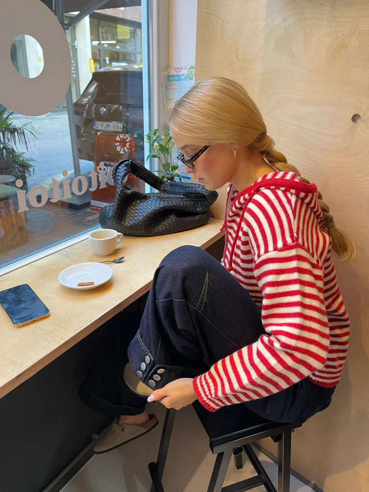 Ce sweat à capuche en maille zippée séduit par son motif rayé intemporel et sa coupe décontractée, parfaite pour un look casual avec du caractère.