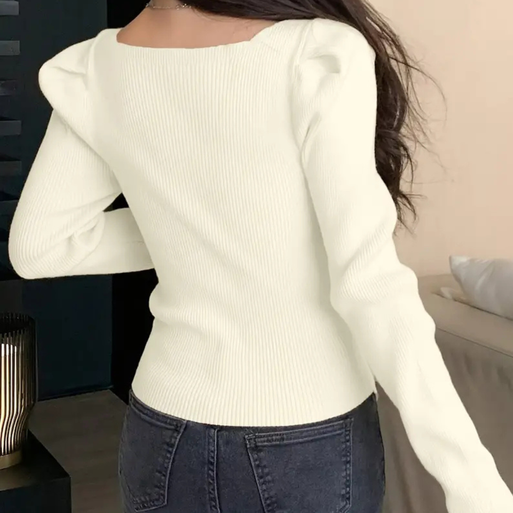 Ce top en maille crème au décolleté carré contrasté est la pièce idéale pour sublimer vos looks du quotidien comme de soirée.