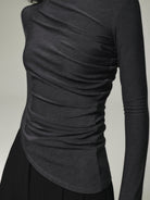 Ce top gris foncé à col montant et drapé asymétrique est parfait pour des tenues sophistiquées, que ce soit pour le travail ou une soirée.
