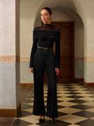 Ce top noir à col haut en tulle et manches longues affiche une silhouette élégante et contemporaine.