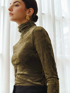 Ce top à col roulé en velours vert olive allie élégance et douceur pour un style raffiné au quotidien ou en soirée.