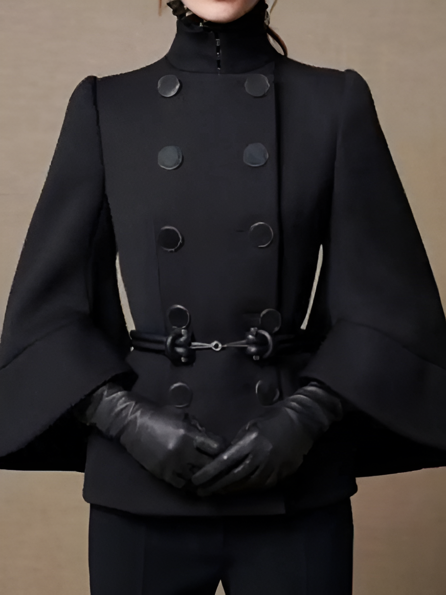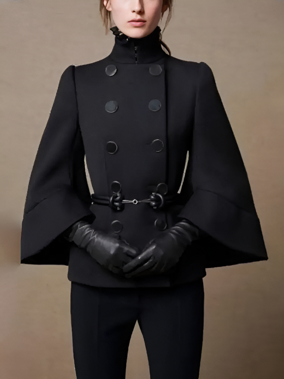 Cette veste à manches cape et fermeture double boutonnage allie structure, élégance et audace dans une silhouette ultra féminine.