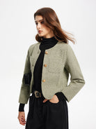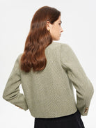 Cette veste courte en tweed apporte une touche chic et intemporelle grâce à sa coupe droite et ses boutons dorés.