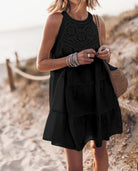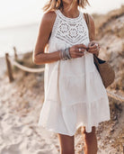 Laissez-vous envoûter par la légèreté de cette robe courte évasée ornée de détails en dentelle délicate.