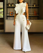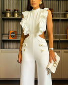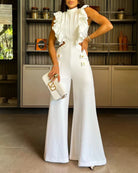 Cette combinaison blanche sans manches avec volants dramatiques et pantalon palazzo incarne l’élégance contemporaine.
