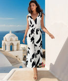 Détails : Décolleté en V profond, imprimé effet pinceau noir sur fond blanc, bretelles larges