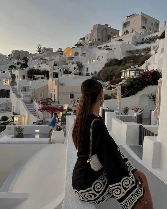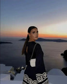 Élégance Grecque | Robe Courte Noire à Motifs Contrastés