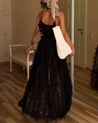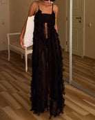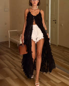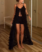 Ce long kimono noir transparent à volants est l’allié parfait pour vos journées ensoleillées.