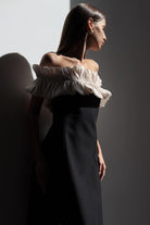 Cette robe midi bicolore séduit par son contraste raffiné entre le noir intense et le volant crème plissé aux épaules.