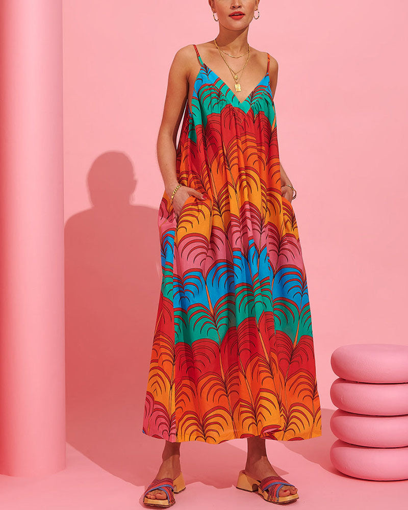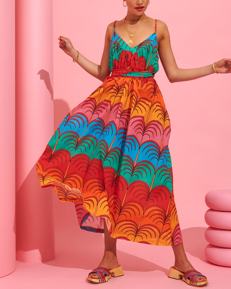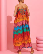 Cette robe fluide à bretelles est une véritable explosion de couleurs et d’énergie.
