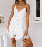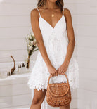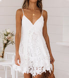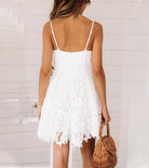 Cette robe courte blanche en dentelle avec fines bretelles est l’essence même de la légèreté et de la féminité.