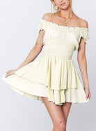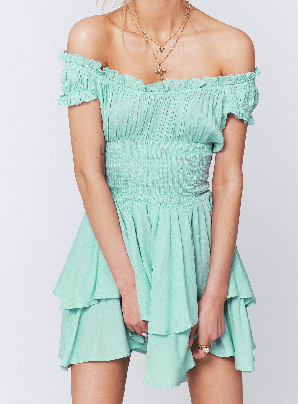 • Coupe : Courte, épaules dénudées, taille smockée, jupe à volants