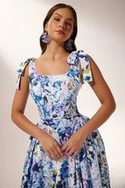Robe de Soirée Fleurie | Bustier Structuré | Imprimé Bleu & Volume Élégant