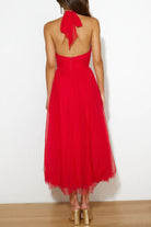 Cette robe mi-longue en tulle rose fuchsia offre une silhouette de princesse moderne avec son col haut noué et sa jupe volumineuse.
