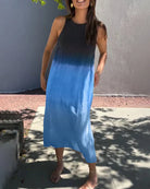 Cette robe longue sans manches en dégradé bleu et noir offre une silhouette épurée, fraîche et moderne.