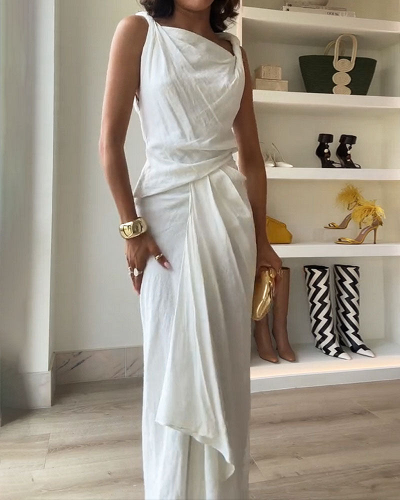 Cette robe drapée blanche à l’allure sculpturale est la définition même du chic intemporel.