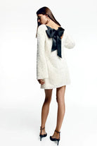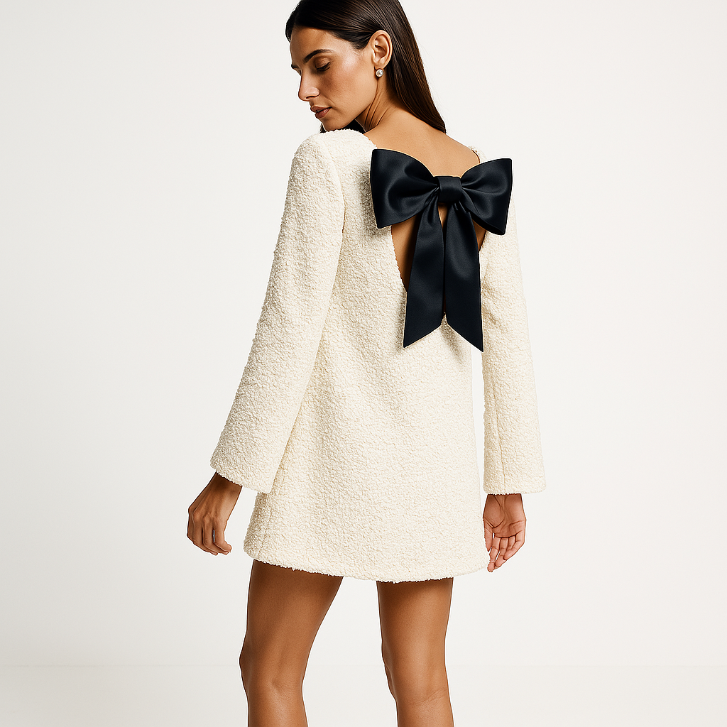 Cette robe courte écrue en tissu texturé séduit par sa simplicité raffinée et son sublime nœud noir dans le dos.